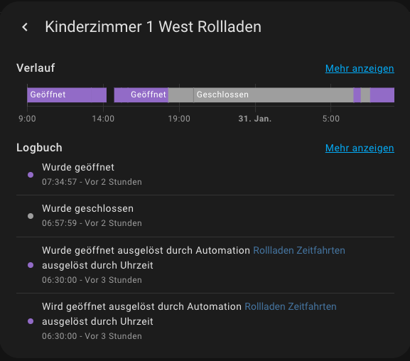 Wie ihr seht, wird der Rollladen, in diesem Fall, um 6.30 Uhr hochgefahren, hat aber einen Befehl um 6.57 Uhr bekommen, um wieder runter zu fahren. Ich habe keine Ahnung, was hier noch mit reinspielt.