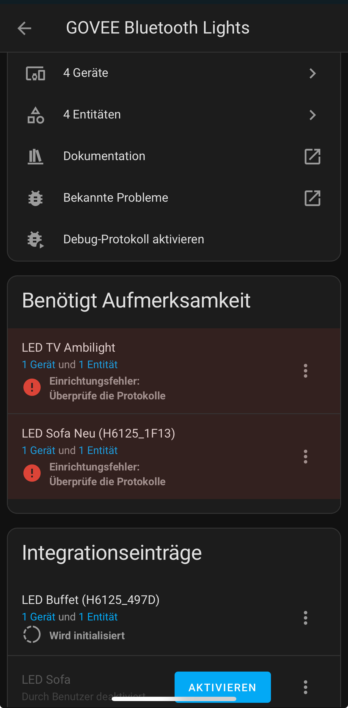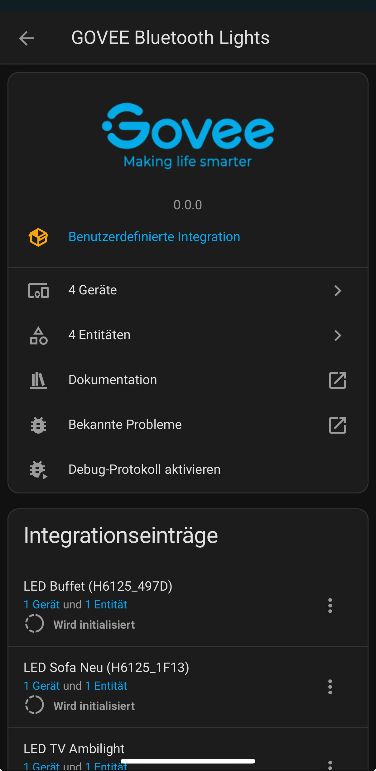 vielleicht kann mir eine/r von Euch helfen. Ich nutze die HACS-Integration zur Steuerung meiner Govee LED-Strips via Bluetooth. Die (derzeit) drei Geräte werden via ESP32s angesteuert, die als BT-Proxies fungieren (und auch laufen).