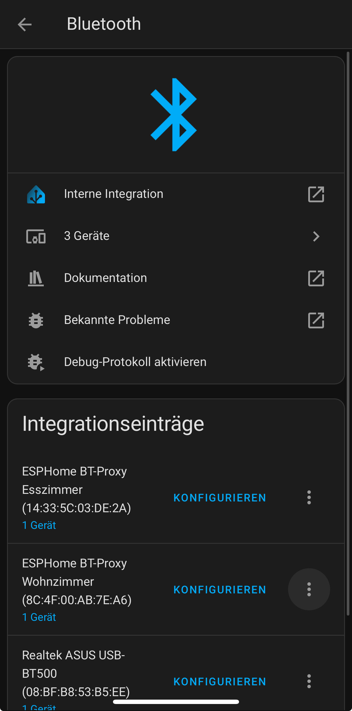 Das hat bis heute Morgen auch gut funktioniert. Nun laden aber die Integrationseinträge nicht mehr. Die beiden ESP32s werden in der Bluetooth-Integration und in ESPHome als verfügbar angezeigt.